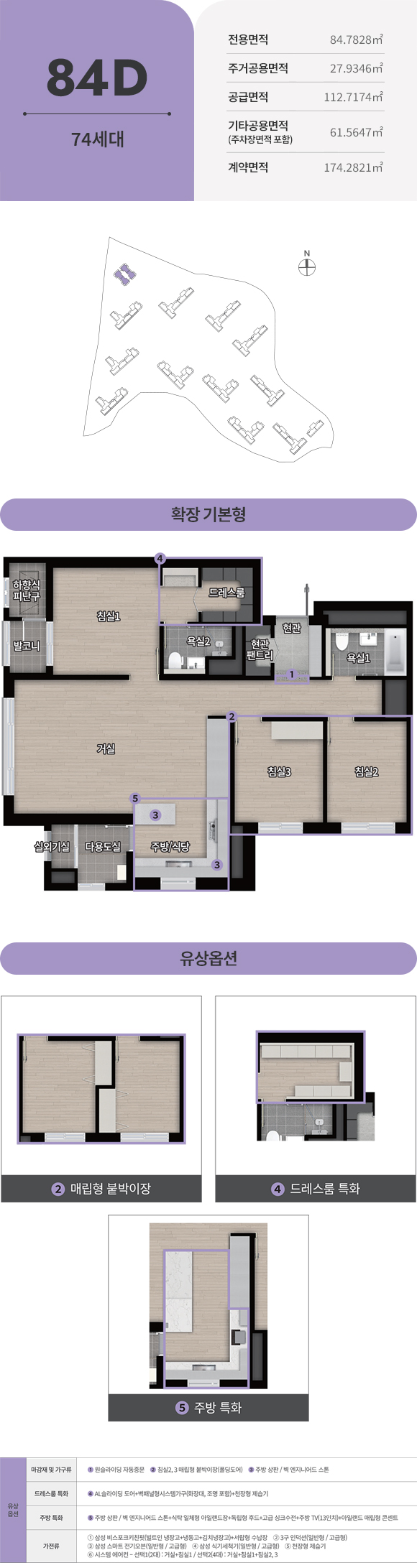 - 유상옵션: 드레스룸 특화, 주방 특화, 시스템 에어컨, 삼성 비스포크 가전 등